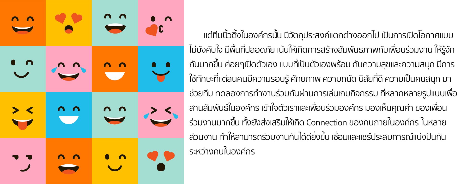 1. หัวใจของทีมบิ้วดิ้ง มุ่งเน้นให้คนในองค์กร เกิดMindsetที่ดีในการทำงาน เข้าใจผู้อื่นได้มากขึ้น